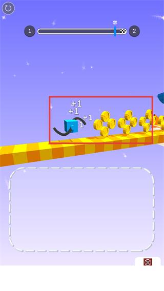 3、控制方塊移動過程中,收集道路上的金幣,每次收集會獲得【+1】積分加成。