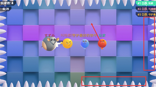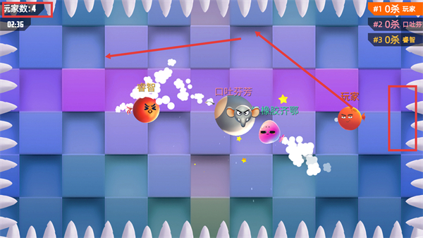 2、進入戰(zhàn)場后,操控角色避開邊緣的尖刺區(qū)域,同時觀察其他玩家的位置,尋找時機碰撞敵方角色來積累擊殺數(shù)。
