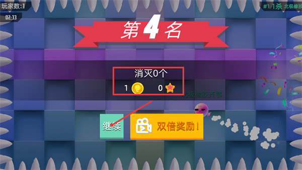 4、本局獲得【第4名】,消滅數(shù)為【0個】,可獲得【1】金幣,點擊【繼續(xù)】可開啟下一局對戰(zhàn)提升排名。
