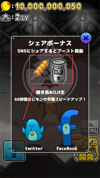 4、通過(guò)SNS分享觸發(fā)【燒鳥】加成,60秒內(nèi)可提升角色勞作速度,快速積累更多資源。