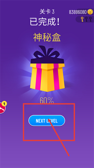 4、關(guān)卡完成后會出現(xiàn)神秘盒,點(diǎn)擊按鈕可進(jìn)入下一關(guān)繼續(xù)體驗(yàn)解壓樂趣。