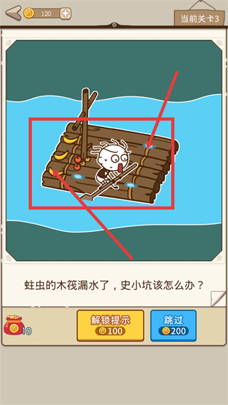 3、木筏漏水時(shí),用攜帶的【香蕉】修補(bǔ)漏洞,將香蕉放置在漏水處可堵住缺口,保障木筏的浮力和史小坑的安全。