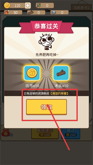 4、過關(guān)后領(lǐng)取坑幣和木頭獎(jiǎng)勵(lì),積累資源可購(gòu)買潮濕的草棚,提升荒島生存的基礎(chǔ)設(shè)施和生存能力。