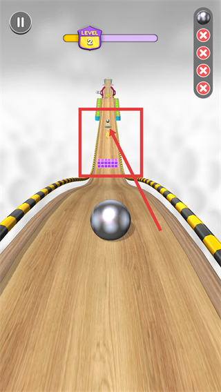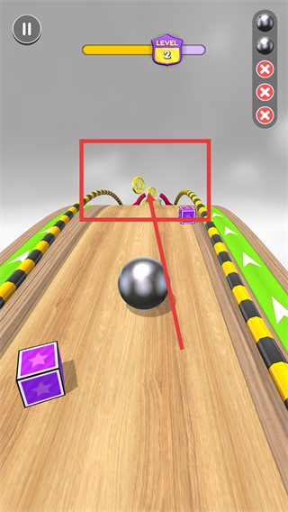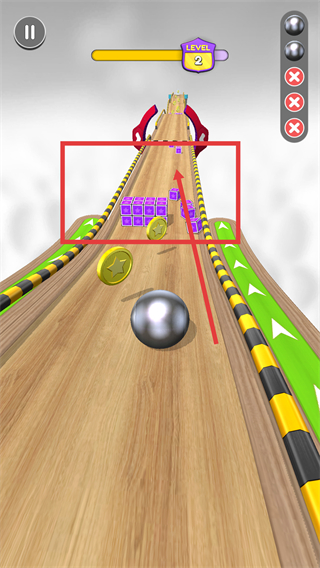 2、軌道上出現(xiàn)金幣和紫色方塊,上坡時(shí)需調(diào)整速度收集金幣,同時(shí)避開兩側(cè)障礙,保持小球滾動(dòng)穩(wěn)定。