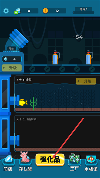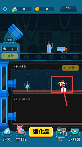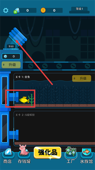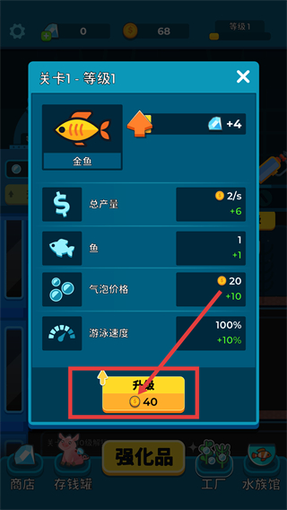 4、消耗金幣點擊升級按鈕,提升金魚總產(chǎn)量和數(shù)量,增強氣泡收集與金幣獲取效率。