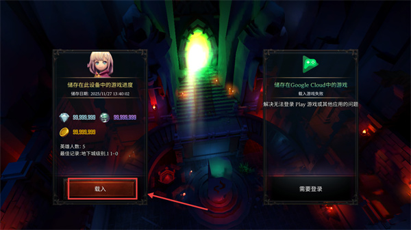 1、在進(jìn)度選擇界面,點(diǎn)擊【載入】按鈕讀取設(shè)備內(nèi)的游戲進(jìn)度,可直接進(jìn)入擁有高資源與5名英雄的存檔,無(wú)需重新開(kāi)局。