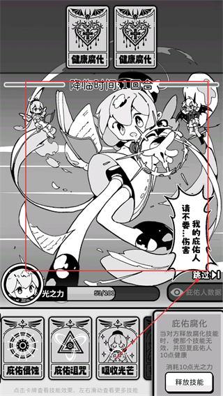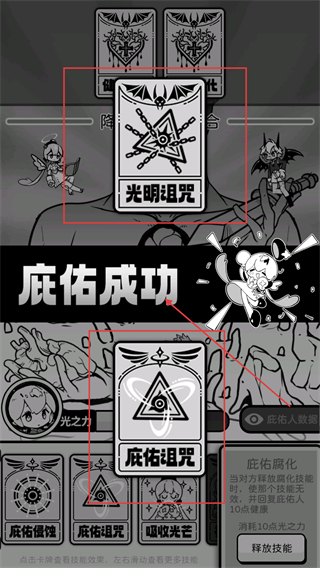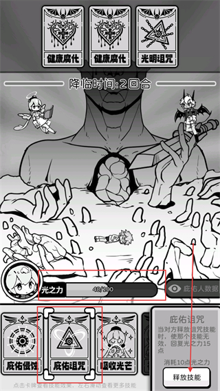 1、在對(duì)抗地獄使者的戰(zhàn)斗中,消耗10光之力選【庇佑詛咒】卡牌,點(diǎn)擊【釋放技能】,準(zhǔn)備無(wú)效對(duì)方詛咒類(lèi)技能。