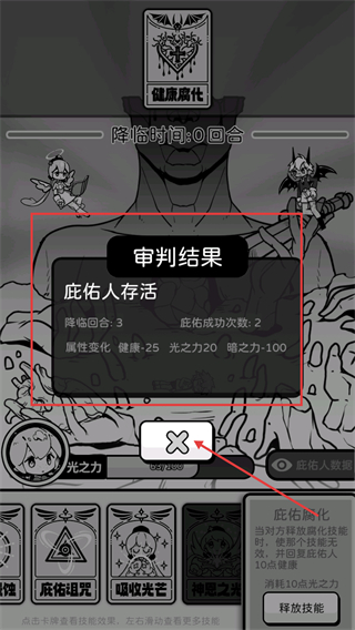 4、戰(zhàn)斗結(jié)束后出現(xiàn)【審判結(jié)果】彈窗,確認(rèn)庇佑人存活,點(diǎn)擊叉號(hào)關(guān)閉彈窗,完成此次庇佑挑戰(zhàn)。