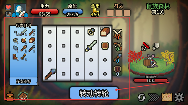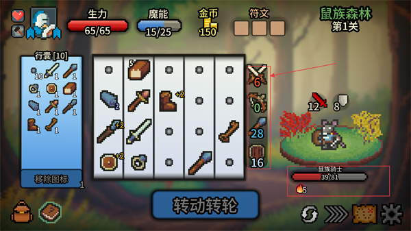 2、進入戰(zhàn)斗界面后,點擊【轉(zhuǎn)動轉(zhuǎn)輪】獲取符號,借助行囊中的道具元素,對【鼠族騎士】造成傷害削減其生命值。