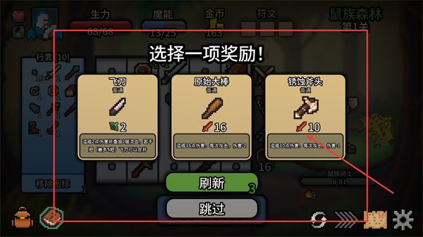 4、戰(zhàn)斗勝利后進入【選擇一項獎勵】界面,挑選【原始大棒】這類高傷道具,補充行囊強化后續(xù)拉桿與戰(zhàn)斗的戰(zhàn)力。